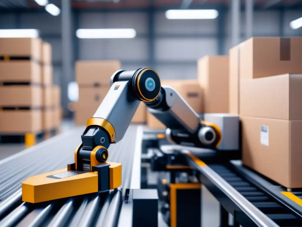 Innovaciones en empaque logístico: Brazo robótico colocando producto en caja en almacén moderno y brillante