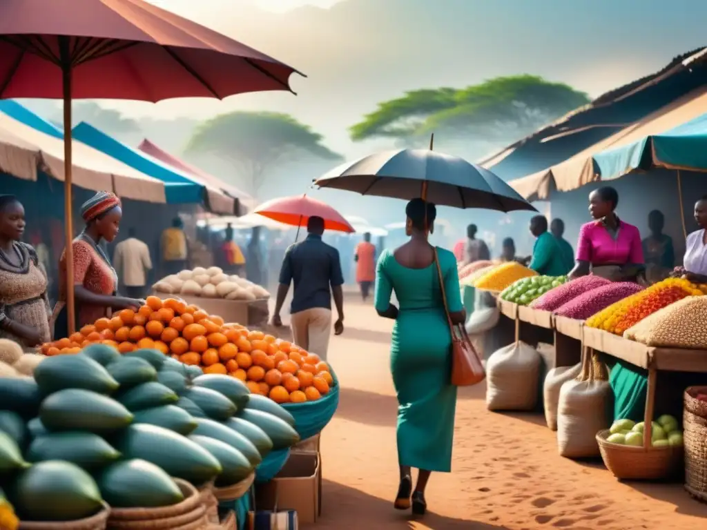 Un bullicioso mercado africano con vendedores y clientes, exhibiendo productos bajo coloridos paraguas